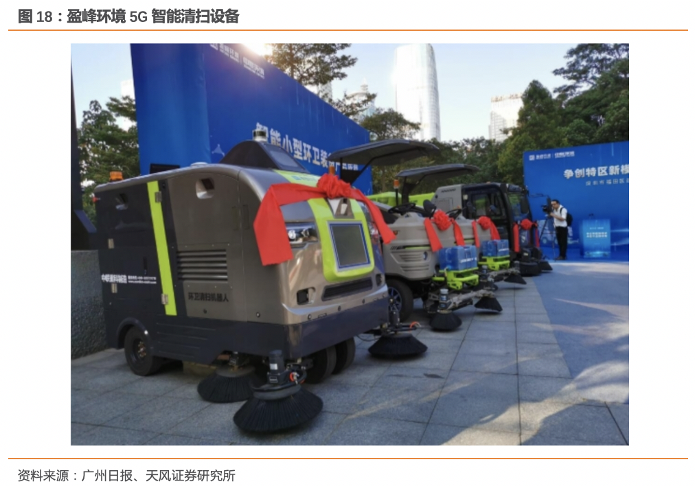 此外,智能化產(chǎn)品逐步開始由概念到落地運(yùn)營,2019年盈峰環(huán)境組建的“5G+環(huán)衛(wèi)機(jī)器人編隊(duì)”正式投入深圳市福田區(qū)福田街道清掃保潔工作,成為國內(nèi)首個落地運(yùn)營的5G智能清掃環(huán)衛(wèi)PPP項(xiàng)目,智能設(shè)備安裝5G數(shù)據(jù)終端,基于物聯(lián)網(wǎng)進(jìn)行調(diào)動和管理,并通過人工智能技術(shù)進(jìn)一步提升市政環(huán)衛(wèi)作業(yè)的效率和效果。
