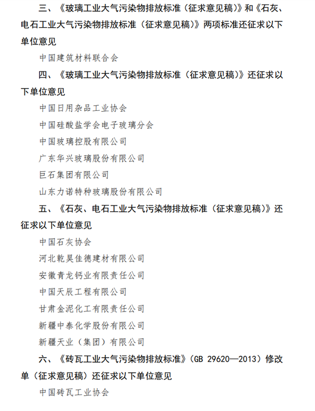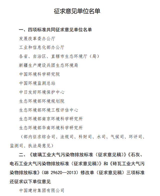 近日,生態(tài)環(huán)境部發(fā)布關(guān)于征求《玻璃工業(yè)大氣污染物排放標(biāo)準(zhǔn)(征求意見稿)》、《石灰、電石工業(yè)大氣污染物排放標(biāo)準(zhǔn)(征求意見稿)》、《磚瓦工業(yè)大氣污染物排放標(biāo)準(zhǔn)修改單(征求意見稿)》和《無機化學(xué)工業(yè)污染物排放標(biāo)準(zhǔn)修改單(征求意見稿)》四項國家環(huán)境保護標(biāo)準(zhǔn)意見的函。