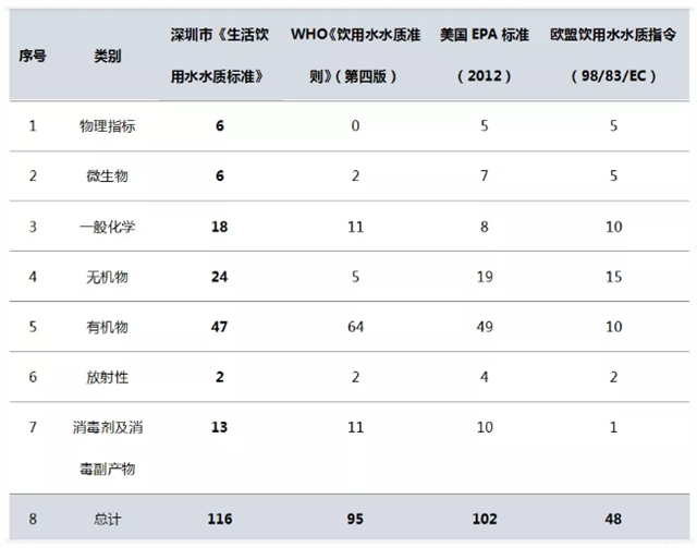 深圳市《生活飲用水水質標準》與國際標準相比,116項指標有84項對標國際嚴格標準或嚴于國際標準;有26項未對標國際嚴格標準;有6項國際標準無此指標。