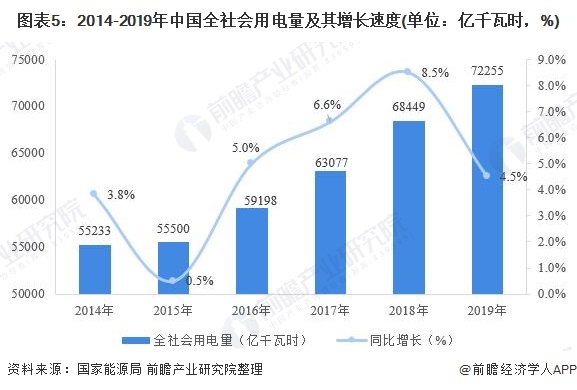 我國作為電力生產大國,同時也是電力消耗大國,近年來,我國全社會用電量持續(xù)提升。根據國家能源局發(fā)布2019年全社會用電量等數據顯示,2019年,全社會用電量72255億千瓦時,同比增長4.5%。