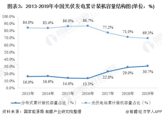 從我國光伏發(fā)電裝機容量結構來看,隨著近年來國家政策往分布式光伏發(fā)電的傾斜,我國光伏發(fā)電市場結構發(fā)生明顯變化,尤其是2016年以來,隨著分布式發(fā)電的快速發(fā)展,累計裝機容量份額持續(xù)提升,到2019年,我國分布式光伏發(fā)電累計裝機容量市場占比已提升至30.7%,首次超過30%。