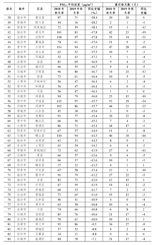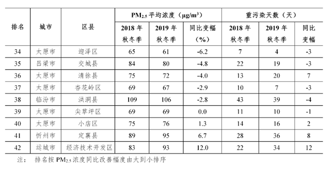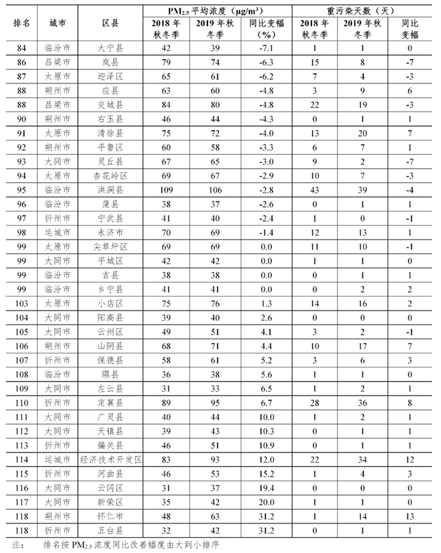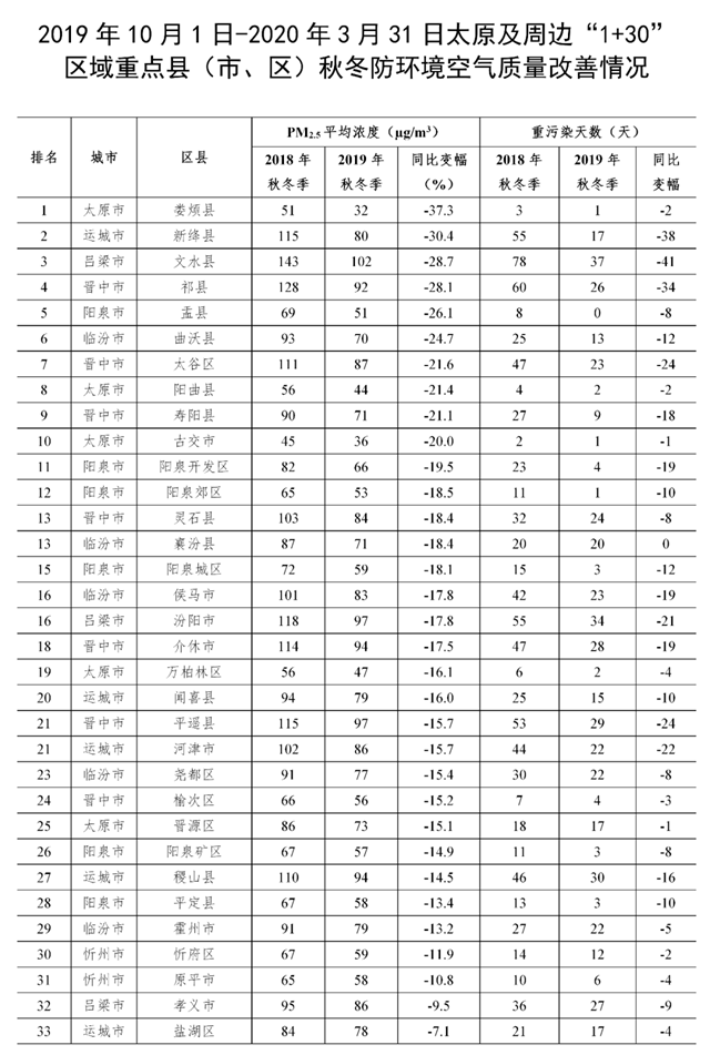 近日,山西省大氣污染防治工作領(lǐng)導(dǎo)組辦公室通報了2019年10月1日-2020年3月31日秋冬防期間,全省各縣(市、區(qū))環(huán)境空氣質(zhì)量改善情況。