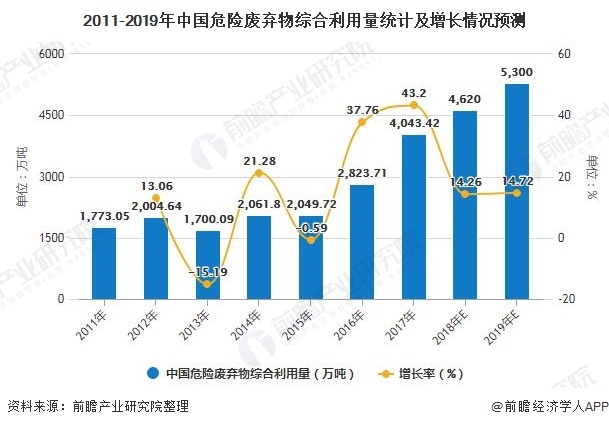 2019-2020年,清廢行動逐漸向全國擴散,有利于推動危廢處理行業(yè)市場擴大,前瞻初步估計我國危險廢棄物綜合利用量為5300萬噸,預計2020年,我國危廢綜合利用量將呈現(xiàn)快速增長。