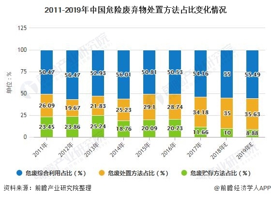 隨著環(huán)保行業(yè)的發(fā)展,我國危險廢棄物處置中綜合利用比重越來越高,由2011年的50.47%溫和上升到2017年的54.16%,前瞻初步估計2019年,危廢綜合利用占比將達到55.49%,深度資源化正成為危廢行業(yè)的發(fā)展方向;2015以來危廢貯存占比逐年下降,初步估計2019年危廢貯存量占比為8.88%;危廢處置占比也呈現(xiàn)增長態(tài)勢,初步估計2019年危廢處置方法占比達到35.63%。