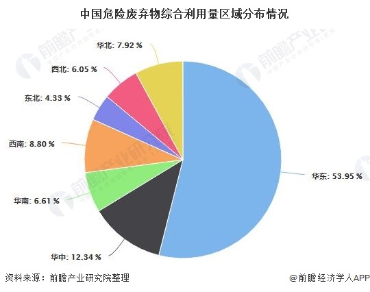 3、中國危廢綜合利用能力快速提升,華東地區(qū)占據(jù)危廢綜合利用量半壁江山