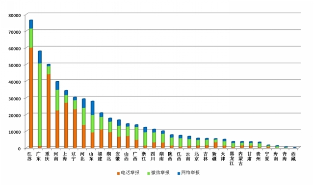 圖2 2019年全國(guó)各省(區(qū)、市)舉報(bào)情況