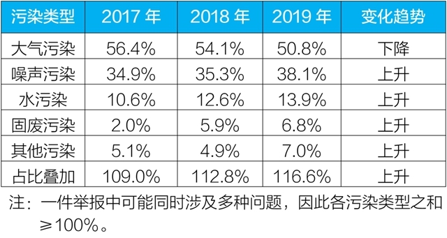 2019年各類舉報(bào)中,大氣污染占50.8%,噪聲污染占38.1%,水污染占13.9%,固廢污染占6.8%,其他問題占7.0%。2017-2019年,大氣污染舉報(bào)占比持續(xù)下降,而水、噪聲、固廢的舉報(bào)占比持續(xù)上升,其中固廢污染舉報(bào)上升趨勢(shì)明顯,且各類污染占比疊加值不斷上升,詳見表2。