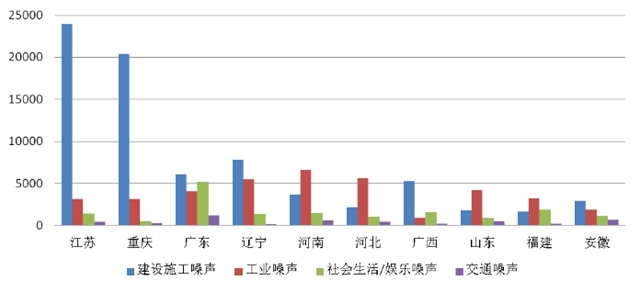 2019年全國(guó)噪聲污染舉報(bào)中,建設(shè)施工噪聲為群眾關(guān)注焦點(diǎn),舉報(bào)量占噪聲舉報(bào)的45.4%,其次為工業(yè)噪聲,占26.5%。噪聲污染舉報(bào)數(shù)量前十的省(區(qū)、市)中,江蘇、重慶建設(shè)施工噪聲問題較為嚴(yán)重,分別占全國(guó)同類型舉報(bào)的26.0%和22.2%;河南、河北、山東工業(yè)噪聲問題相對(duì)突出。