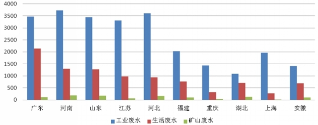 2019年全國(guó)水污染舉報(bào)中,工業(yè)廢水占47.3%,生活污水占21.0%,礦山廢水占3.1%。水污染舉報(bào)數(shù)量前十的省(區(qū)、市)中,廣東、河南、山東、江蘇、河北工業(yè)廢水舉報(bào)量較多,均在3000件以上,上海、河北工業(yè)廢水問題在當(dāng)?shù)乇容^突出,相關(guān)舉報(bào)占比高于全國(guó)平均水平約20個(gè)百分點(diǎn)。