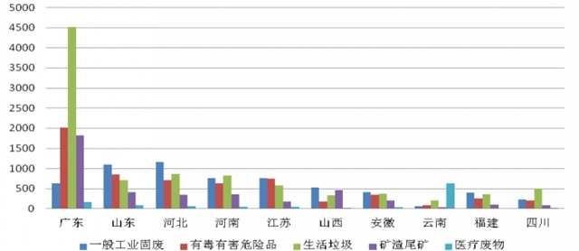 2019年全國(guó)固廢污染舉報(bào)中,生活垃圾占36.4%,一般工業(yè)固廢占23.6%,危險(xiǎn)廢物占23.2%,礦渣尾礦占13.7%,醫(yī)療廢物占4.2%。廣東固廢污染相對(duì)突出,舉報(bào)量占全國(guó)固廢舉報(bào)總量的26.8%,其中生活垃圾舉報(bào)占一半。