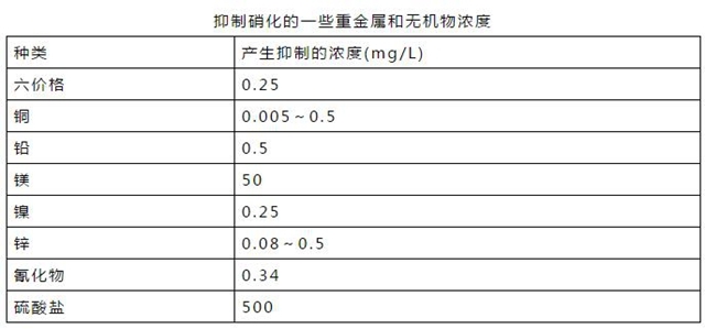 某些重金屬離子、絡(luò)合陰離子、氰化物以及一些有機(jī)物質(zhì)會(huì)干擾或破壞硝化細(xì)菌的正常生理活動(dòng)。當(dāng)這些物質(zhì)在污水中的濃度較高,便會(huì)抑制生物硝化的正常運(yùn)行。例如,當(dāng)鉛離子大于0.5mg/L、酚大于5.6mg/L、硫脲大于0.076mg/L時(shí),硝化均會(huì)受到抑制。有趣的是,當(dāng)NH3-N濃度大于200mg/L時(shí),也會(huì)對硝化過程產(chǎn)生抑制,但城市污水中一般不會(huì)有如此高的NH3-N濃度。