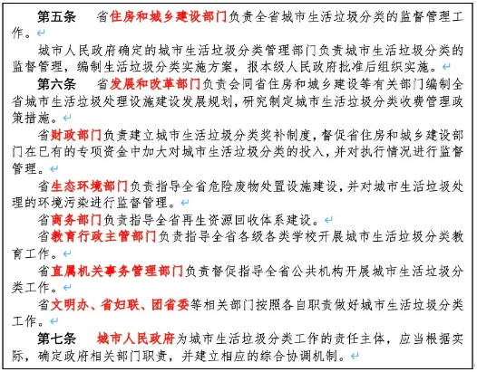垃圾分類涉及的固體廢棄物種類多、參與主體多、全流程環(huán)節(jié)多,過去多次垃圾分類嘗試的失敗,均與主管機(jī)構(gòu)責(zé)權(quán)不清、管理邊界模糊,政府的主體監(jiān)管責(zé)任落實(shí)不到位有一定關(guān)系。此次山西省在生活垃圾分類管理規(guī)定中,開篇明確了監(jiān)督管理、規(guī)劃設(shè)計(jì)、收費(fèi)機(jī)制、獎(jiǎng)補(bǔ)經(jīng)費(fèi)、各類垃圾處置主管單位及宣傳教育的直接責(zé)任單位,將單中心的管理模式通過清晰的分工加以細(xì)化,使得省級文件在落實(shí)過程中更具可操作性。