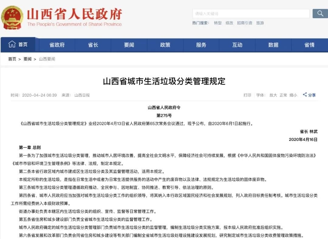 2020年4月16日,山西省人民政府第65次常務(wù)會(huì)議通過《山西省城市生活垃圾分類管理規(guī)定》自2020年6月1日起施行。生活垃圾按照: 可回收物、有害垃圾、廚余垃圾、其他垃圾進(jìn)行分類、大件垃圾和裝修垃圾單獨(dú)分類。本《規(guī)定》的出臺(tái),標(biāo)志著山西省將全域邁向生活垃圾分類管理的新階段。