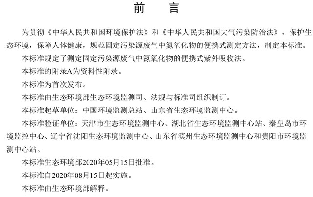 為貫徹《中華人民共和國環(huán)境保護(hù)法》和《中華人民共和國大氣污染防治法》,保護(hù)生態(tài)環(huán)境,保障人體健康,規(guī)范固定污染源廢氣中氮氧化物的便攜式測(cè)定方法,制定本標(biāo)準(zhǔn)。本標(biāo)準(zhǔn)規(guī)定了測(cè)定固定污染源廢氣中氮氧化物的便攜式紫外吸收法。本標(biāo)準(zhǔn)的附錄A為資料性附錄。本標(biāo)準(zhǔn)為首次發(fā)布。