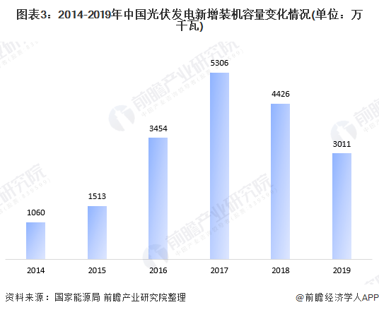 據(jù)國(guó)家能源局統(tǒng)計(jì)數(shù)據(jù)顯示,2017年,我國(guó)光伏發(fā)電新增裝機(jī)容量為5306萬(wàn)千瓦,創(chuàng)歷史新高。2018年之后,受光伏531新政影響,各地光伏發(fā)電新增項(xiàng)目有所下滑。2019年,全國(guó)新增光伏發(fā)電裝機(jī)3011萬(wàn)千瓦,同比下降31.6%。累計(jì)裝機(jī)容量已增長(zhǎng)至20430萬(wàn)千瓦。