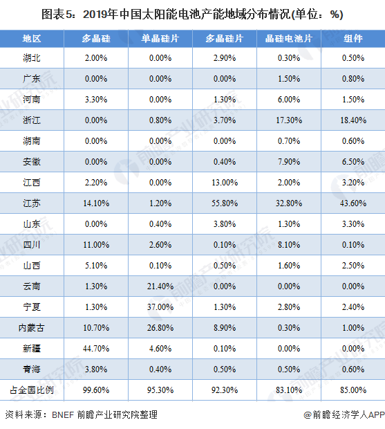 太陽(yáng)能電池主要由多晶硅、單晶硅片、多晶硅片、晶硅電池片等組成,從區(qū)域分布來看,2019年我國(guó)太陽(yáng)能電池相關(guān)組件的產(chǎn)能分布較為廣泛,多晶硅和硅片的產(chǎn)能主要集中在電價(jià)更低的西部地區(qū),尤其是新疆、四川、寧夏、云南等地。電池片和組件主要集中在東部地區(qū),如浙江和江蘇,兩者產(chǎn)能占全國(guó)產(chǎn)能比重超過60%。