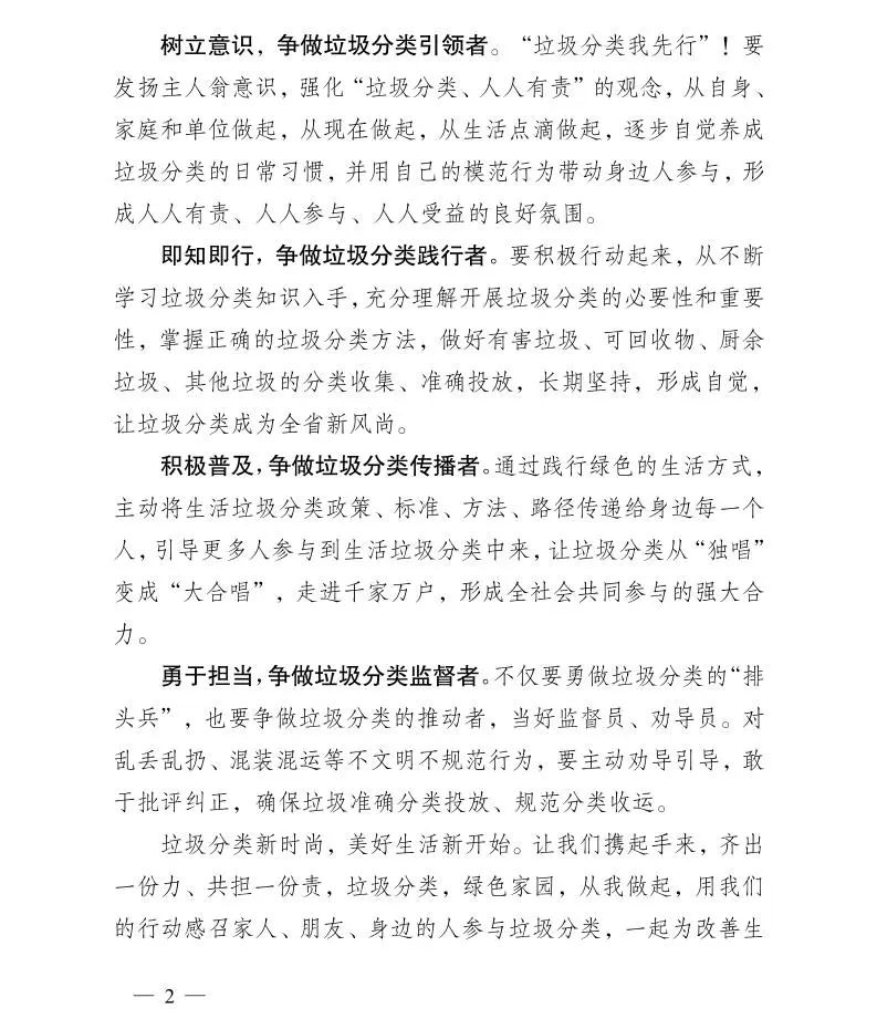 垃圾分一分,生活美十分。習(xí)近平總書(shū)記指出,垃圾分類(lèi)就是新時(shí)尚;推行垃圾分類(lèi),關(guān)鍵是要加強(qiáng)科學(xué)管理,形成長(zhǎng)效機(jī)制,推動(dòng)習(xí)慣養(yǎng)成。實(shí)行垃圾分類(lèi)是減少垃圾產(chǎn)生量、促進(jìn)資源回收、緩解環(huán)境壓力、改善生態(tài)環(huán)境的重要舉措,關(guān)系廣大人民群眾生活環(huán)境,關(guān)系節(jié)約使用資源,也是社會(huì)文明水平的一個(gè)重要體現(xiàn)。為響應(yīng)黨中央號(hào)召,推動(dòng)垃圾分類(lèi)在我省更好落地落實(shí),到 2025 年全省地級(jí)以上城市基本建成生活垃圾分類(lèi)處理系統(tǒng),我們向城鄉(xiāng)居民朋友們發(fā)出倡議,全社會(huì)人人動(dòng)手,讓我們的舉手之勞成為一種習(xí)慣,一種素養(yǎng),一種航標(biāo),一起為改善生活環(huán)境作努力,共建共享生態(tài)環(huán)保生活。