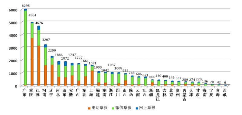 從各地區(qū)不同渠道舉報數(shù)量看,廣東、重慶、江蘇、河南等地舉報總量居前,重慶、上海等地電話舉報占比較高,廣東、浙江、江西、黑龍江等地微信舉報占比較高。