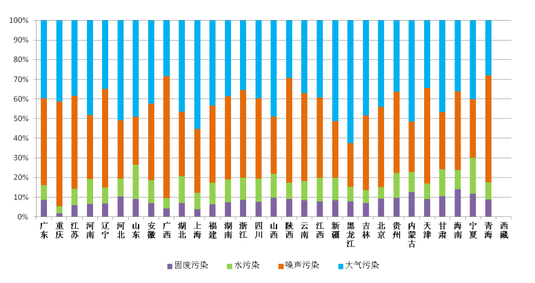從各省舉報污染類型占比來看,黑龍江大氣污染舉報在當?shù)卣急容^高,占比高于全國平均水平約20個百分點,主要反映煙粉塵污染問題。廣西、重慶噪聲污染舉報在當?shù)叵鄬ν怀?,占比高于全國平均水平約12個百分點,廣西主要反映工業(yè)噪聲污染問題,重慶主要反映建設(shè)施工噪聲污染問題。寧夏、山東水污染舉報在當?shù)卣急雀哂谌珖骄郊s8個百分點,主要反映生活污水和工業(yè)廢水污染問題。