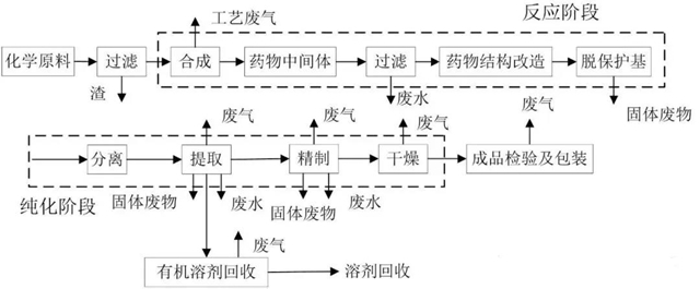 化學(xué)合成工序主要大氣污染物包括顆粒物、氯化氫和氨等無機(jī)物,以及化學(xué)合成使用的有機(jī)原料和有機(jī)溶劑,如苯、甲苯、氯苯、氯仿、丙酮、苯胺、二甲基亞砜、乙醇、甲醇、甲醛等。