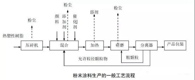 粉末涂料通常是由聚合物、顏料、助劑等混合粉碎加工而成。粉末涂料的制備方法大致可分為干法和濕法兩種方法,干法涂料生產(chǎn)主要是熔融混合法;濕法工藝有蒸發(fā)法、噴霧干燥法和沉淀法。蒸發(fā)法是先配置溶劑型涂料、然后用薄膜蒸發(fā)、真空蒸餾等法除去溶劑得到固體涂料,然后經(jīng)過粉粹、過篩分級(jí)得到粉末涂料,主要是丙烯酸樹脂基粉末涂料生產(chǎn),使用較多的是薄膜蒸發(fā)器和行星螺桿擠出機(jī);噴霧干燥法則是先配置溶劑型涂料,經(jīng)過研磨、調(diào)色,然后分別噴霧干燥造粒或者在液體沉淀造粒得到粉末涂料。