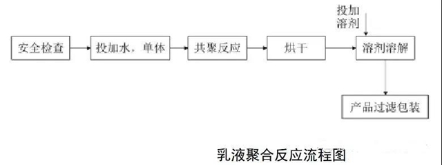 水基膠黏劑的生產(chǎn)工藝通常是采用乳液聚合法生成,即以水作為外相,單體在乳化劑或者表面活性劑和充分?jǐn)嚢璧那闆r,通過膠束分散于水相并發(fā)生增溶溶解。通過添加水溶性引發(fā)劑(如過硫酸鉀等)后,一經(jīng)加熱,引發(fā)劑就開始分解并產(chǎn)生自由基,進(jìn)而引發(fā)膠束中單體發(fā)生聚合或者共聚反應(yīng)。