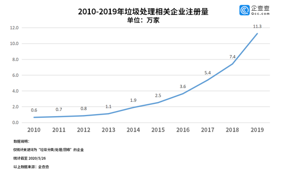 隨著城鎮(zhèn)化進程的加快和消費水平的提升,生活垃圾產(chǎn)生量逐年攀升,與垃圾處理相關(guān)的企業(yè)數(shù)量也逐年增長。企查查數(shù)據(jù)顯示,過去十年來我國垃圾處理相關(guān)的企業(yè)注冊量不斷增長,2018年相關(guān)企業(yè)注冊量為7.4萬,2019年相關(guān)企業(yè)注冊量為11.3萬,同比增長52.7%。