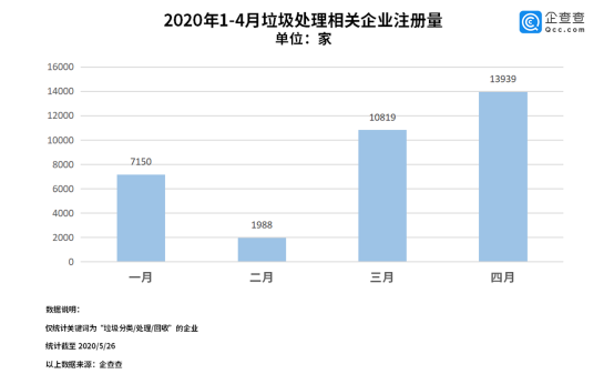 2020年1月至4月,我國垃圾處理相關(guān)的企業(yè)注冊量為3.4萬家。其中三月份注冊量為1.1萬,環(huán)比上漲444.2%;四月份注冊量為1.4萬,環(huán)比上漲28.8%。去年同期(2019年1月至4月),我國垃圾處理相關(guān)的企業(yè)注冊量為3.1萬家。相比去年,今年1月至4月我國垃圾處理相關(guān)的企業(yè)注冊量同比上漲9.6%。