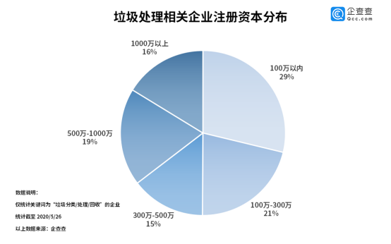 從企業(yè)注冊資本分布來看,企查查數(shù)據(jù)顯示,我國垃圾處理相關(guān)的企業(yè)注冊資本分布在300萬以內(nèi)的企業(yè)數(shù)量最多,占比50%,500萬-1000萬的占比19%,1000萬以上的占比16%。