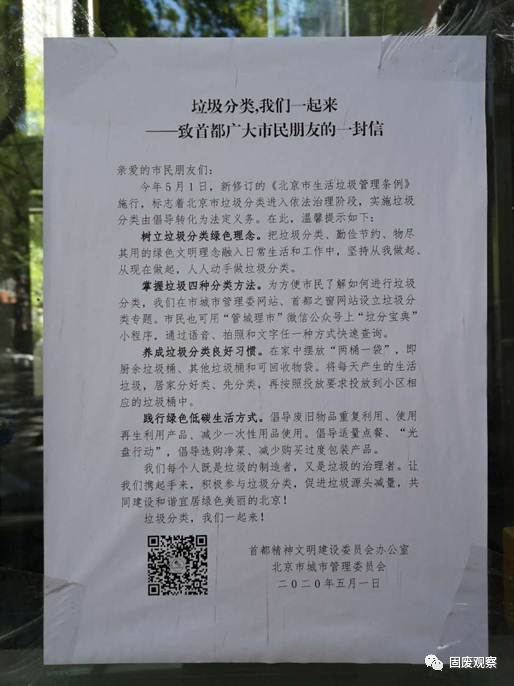垃圾分類的宣傳和指導(dǎo)如何進(jìn)一步加強(qiáng)?藍(lán)藍(lán)天工作室記者觀察自己所在的小區(qū)發(fā)現(xiàn),設(shè)了分類垃圾桶,旁邊沒有專業(yè)指導(dǎo)人員,居民分不分類、分得對不對,基本全憑自覺。上海市剛推行垃圾分類的時候,經(jīng)常有志愿者站在垃圾桶旁問前來投放的居民“你是什么垃圾”。為啥北京很多小區(qū)目前沒人問這樣的問題?國務(wù)院發(fā)展研究中心資源與環(huán)境政策研究所副所長常紀(jì)文表示,從5月1日《條例》開始執(zhí)行后,他天天去附近小區(qū)拍照檢查??傮w看來垃圾分類已經(jīng)起步了,各小區(qū)基本都配備了廚余垃圾桶等,但仍然存在一些問題。例如,部分小區(qū)內(nèi)沒有宣傳橫幅,分類垃圾桶邊沒有配備專人進(jìn)行指導(dǎo)監(jiān)督。一些小區(qū)宣傳和指導(dǎo)不到位,導(dǎo)致居民有分類意識,但缺乏分類知識。“我在不少小區(qū)看到大家把外賣餐盒跟廚余垃圾扔在一起,但它屬于使用過的、沾了菜湯油污的塑料類制品,應(yīng)該投放到其他垃圾桶中?!背<o(jì)文說。在有的小區(qū),為保證每個分類垃圾桶旁都有指導(dǎo)人員,取消了一些垃圾桶,讓居民走到較遠(yuǎn)的投放點(diǎn)扔垃圾。常紀(jì)文表示,他觀察到一些小區(qū)內(nèi)垃圾桶分布不均勻,有些樓棟下缺少廚余垃圾桶,有些沒有其他垃圾桶,“至少應(yīng)該以某種形式讓居民知曉,小區(qū)內(nèi)哪里有對應(yīng)的分類垃圾桶,方便精準(zhǔn)投放?!?/span>劉建國認(rèn)為,現(xiàn)階段,應(yīng)進(jìn)一步加大宣傳教育和組織動員力度,讓垃圾分類真正“熱起來”;層層落實(shí)各級政府相關(guān)職能部門職責(zé),特別是切實(shí)落實(shí)管理責(zé)任人責(zé)任,將壓力和責(zé)任傳導(dǎo)到每個居民,讓垃圾分類“硬起來”;統(tǒng)籌疫情防控和垃圾分類兩項(xiàng)工作,讓二者有機(jī)結(jié)合,互相促進(jìn),讓垃圾分類“動起來”;北京的黨政機(jī)關(guān)、高??蒲性核?、企業(yè)總部、社會組織密集,應(yīng)帶頭做好源頭減量和垃圾分類,為居民作出表率、增添信心,讓垃圾分類“亮起來”。“未來,要從執(zhí)法保障、政策激勵、長效機(jī)制、科學(xué)管理、多元共治、科技支撐等不同層面,不斷完善和優(yōu)化垃圾分類投放、收集、運(yùn)輸、處理全鏈條,倒逼生產(chǎn)生活環(huán)節(jié)源頭減量,分類物品物盡其用各得其所,降低垃圾分類的綜合社會成本,促進(jìn)居民養(yǎng)成良好習(xí)慣,提升社會文明水平?!眲⒔▏f。上圖:北京市有關(guān)部門致市民的一封信。(劉毅攝) 如何避免運(yùn)輸和處置中出現(xiàn)混裝混運(yùn)現(xiàn)象?不少居民表示,推行生活垃圾強(qiáng)制分類以來,自己所在的小區(qū),垃圾分類的宣傳力度明顯加強(qiáng),做到了分類投放、分類運(yùn)輸。然而,也有居民表示,自己辛辛苦苦分好類,甚至把快遞盒上的膠帶都刮下來按類別投放,結(jié)果發(fā)現(xiàn)垃圾車還是把所有垃圾一股腦混倒在一起運(yùn)走。劉建國表示,“前端分類,后端混合”是個廣受詬病的老問題,實(shí)際上是垃圾分類系統(tǒng)前后端不配套造成的?!侗本┦猩罾芾?xiàng)l例》中約束的一個主要對象,是從事垃圾收集運(yùn)輸處理的企業(yè),處罰門檻很低,處罰力度很大,就是為了解決先分后混、混裝混運(yùn)的問題。“居民看到混裝混運(yùn)現(xiàn)象,可以馬上投訴,督促企業(yè)做好分類收集運(yùn)輸處理。當(dāng)然,咱們自己也要做好分類投放,不能以混裝混運(yùn)為借口而不履行義務(wù)。只有大家各負(fù)其責(zé),才能徹底杜絕混裝混運(yùn)現(xiàn)象?!眲⒔▏f。常紀(jì)文認(rèn)為,前端后端匹配才符合垃圾分類的目的。對此需要標(biāo)本兼治:治本,需建設(shè)相匹配的廚余垃圾處置設(shè)施以及干垃圾的焚燒或填埋設(shè)施。治標(biāo),應(yīng)采取嚴(yán)格的處罰措施,沒有處罰,小區(qū)物業(yè)和環(huán)衛(wèi)部門往往會存有僥幸心理,使垃圾分類工作停滯不前;只有嚴(yán)格執(zhí)行懲處措施,才能對垃圾分類執(zhí)行方起到震懾作用,后端的各個環(huán)節(jié)才能順暢配合。為更好解決后端混運(yùn)問題,常紀(jì)文還建議,改良垃圾運(yùn)輸車輛?!皻W洲有許多垃圾分類車輛是能同時運(yùn)輸兩種垃圾的,我們也可以在設(shè)計方面做些改動,在車輛內(nèi)部進(jìn)行分隔,讓一輛車既可以運(yùn)廚余垃圾也可以運(yùn)其他垃圾,降低成本的同時,方便操作?!?/span>劉建國認(rèn)為,疫情防控與垃圾分類這兩件事并不沖突?,F(xiàn)在疫情防控已經(jīng)進(jìn)入到常態(tài)化階段,可以把疫情防控中形成的好經(jīng)驗(yàn)好做法好機(jī)制,如社區(qū)精細(xì)化管理、居民的規(guī)則意識和衛(wèi)生習(xí)慣、鄰里之間互相幫助互相監(jiān)督等,順勢轉(zhuǎn)化為垃圾分類的推動力。來源 | 人民日報中央廚房·藍(lán)藍(lán)天工作室
