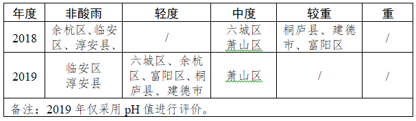 全年杭州市酸雨率54.6%,比2018年上升1.8個(gè)百分點(diǎn)。全市降水pH值范圍為4.00~7.83,pH年均值為5.38,比2018年略有改善。杭州市酸雨程度處于中等水平,總體比2018年度有減輕,大部分地區(qū)處在非酸雨、輕度酸雨區(qū),其中臨安區(qū)、淳安縣處在非酸雨區(qū)。