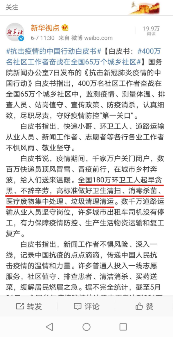 國(guó)務(wù)院新聞辦公室7日發(fā)布《抗擊新冠肺炎疫情的中國(guó)行動(dòng)》白皮書(shū)。白皮書(shū)充分肯定了疫情期間180萬(wàn)環(huán)衛(wèi)工人所付出的努力。
