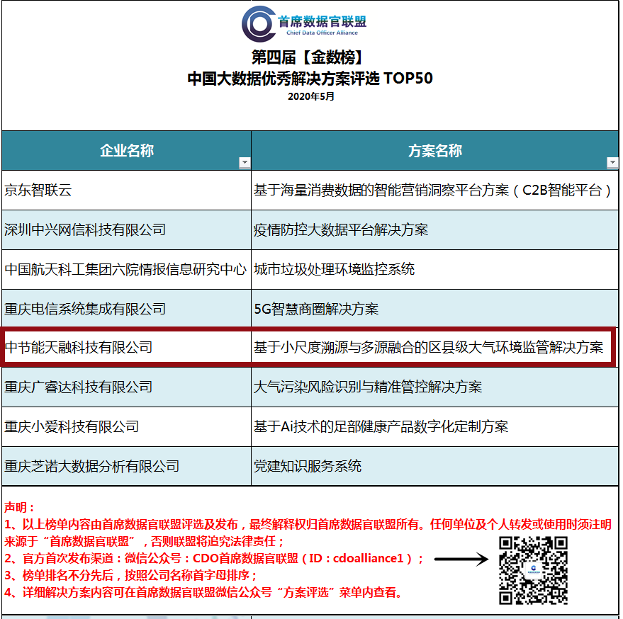 近日,由首席數(shù)據(jù)官聯(lián)盟發(fā)起的第四屆【金數(shù)榜】中國大數(shù)據(jù)優(yōu)秀解決方案及案例TOP50評(píng)選活動(dòng)正式公布評(píng)選結(jié)果,中節(jié)能天融科技有限公司(以下簡(jiǎn)稱“天融科技”)憑借“基于小尺度溯源與多源融合的區(qū)縣級(jí)大氣環(huán)境監(jiān)管解決方案”入選中國大數(shù)據(jù)優(yōu)秀解決方案TOP50。