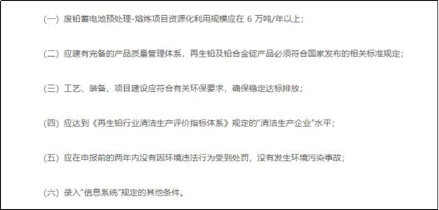 關(guān)于蓄電池的資源利用,《征求意見稿》提出了園區(qū)化管理和企業(yè)管理兩種。其中規(guī)定廢鉛蓄電池資源化利用項(xiàng)目應(yīng)位于功能定位相符、環(huán)?;A(chǔ)設(shè)施齊全的產(chǎn)業(yè)園區(qū)內(nèi);各地市應(yīng)提出轄區(qū)內(nèi)符合條件的規(guī)范資源化利用企業(yè),經(jīng)行業(yè)評(píng)議、部委合議后錄入“信息系統(tǒng)”,具體條件如下: