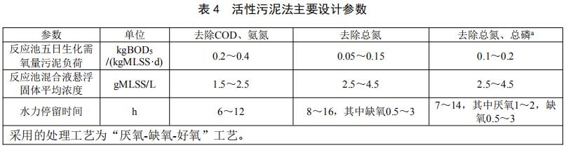 8.2.3.8 活性污泥法宜通過投加填料等方式,提高污泥濃度和耐沖擊負荷能力,改善處理效果。主要設(shè)計參數(shù)宜參考表 4 取值。采用活性污泥法時,進水 BOD5含量不宜小于 60mg/L。