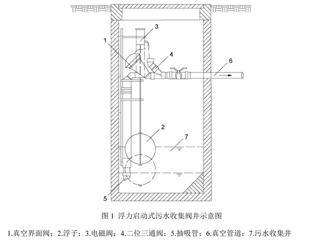 收集井是污水由重力流轉向真空流的過渡裝置,通常設置于各單體建筑附近,視具體情況每棟建筑可設置1個或多個。收集井的上方設真空啟動裝置,通過井內污水液位控制真空閥開啟。收集井常見結構如圖1所示。