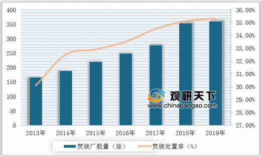△2013-2019年中國城市生活垃圾焚燒廠數(shù)量及焚燒處理率
