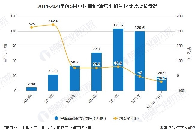 截止至2020年1-5月中國新能源汽車銷量達(dá)到28.9萬輛,同比下降38.7%。