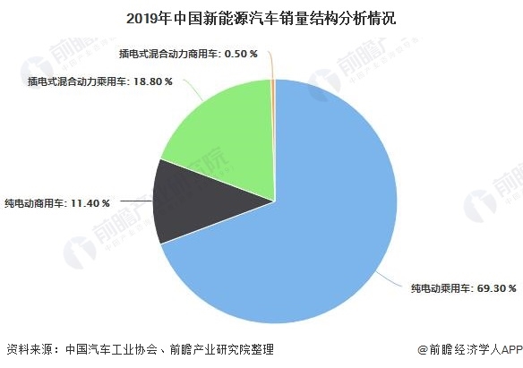 從我國新能源汽車銷量結(jié)構(gòu)來看,純電動乘用車銷量最高。2019年,我國純電動乘用車占我國新能源汽車總銷量的比重約為69.3%;插電式混合動力乘用車和純電動商用車占比分別為18.8%和11.4%,插電式混合動力商用車銷量占比為0.5%。