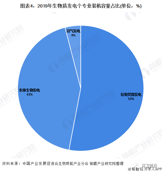 截至2019年底在各類(lèi)生物質(zhì)能中,垃圾焚燒發(fā)電裝機(jī)容量占生物質(zhì)發(fā)電裝機(jī)總?cè)萘康?3%,排名第一;農(nóng)林生物發(fā)電裝機(jī)容量占比為43%;沼氣發(fā)電裝機(jī)容量占比為4%。