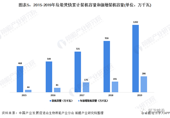 截至2019年底,全國(guó)30個(gè)省(區(qū)、市)垃圾焚燒發(fā)電累計(jì)裝機(jī)容量為1202萬(wàn)千瓦,較2018年增長(zhǎng)31%,2019年新增發(fā)電裝機(jī)容量286萬(wàn)千瓦。