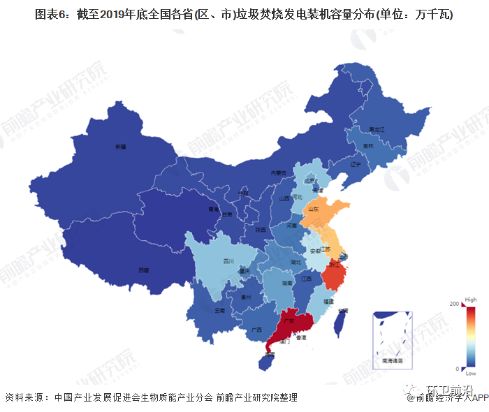 截至2019年底,垃圾焚燒發(fā)電累計(jì)裝機(jī)容量排名前五的省份分別是廣東省、浙江省、山東省、江蘇省和安徽省。這五個(gè)省份合計(jì)裝機(jī)容量占全國(guó)累計(jì)裝機(jī)容量的58.9%。