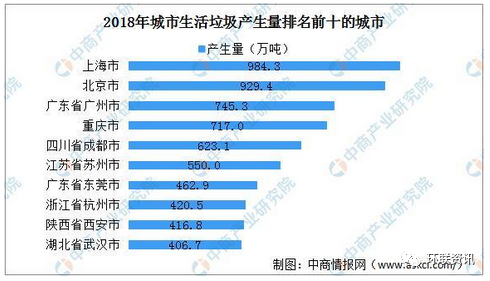 前十城市生活垃圾產(chǎn)生量共計6256.0萬噸,占全部信息發(fā)布城市產(chǎn)生總量的29.6%。經(jīng)濟發(fā)達的城市生活垃圾產(chǎn)量大,上海、北京生活垃圾產(chǎn)生量超900萬噸,分別為984.3萬噸、929.4萬噸。此外,廣州市、重慶市、成都市、蘇州市生活垃圾產(chǎn)生量超500萬噸。