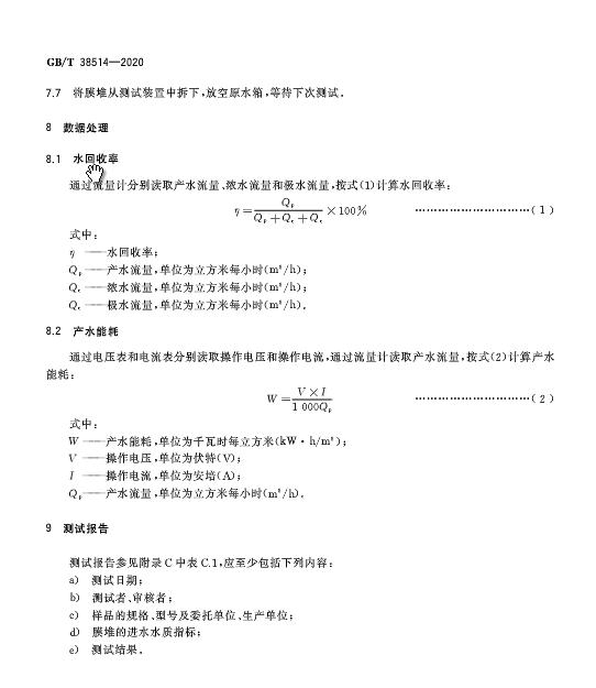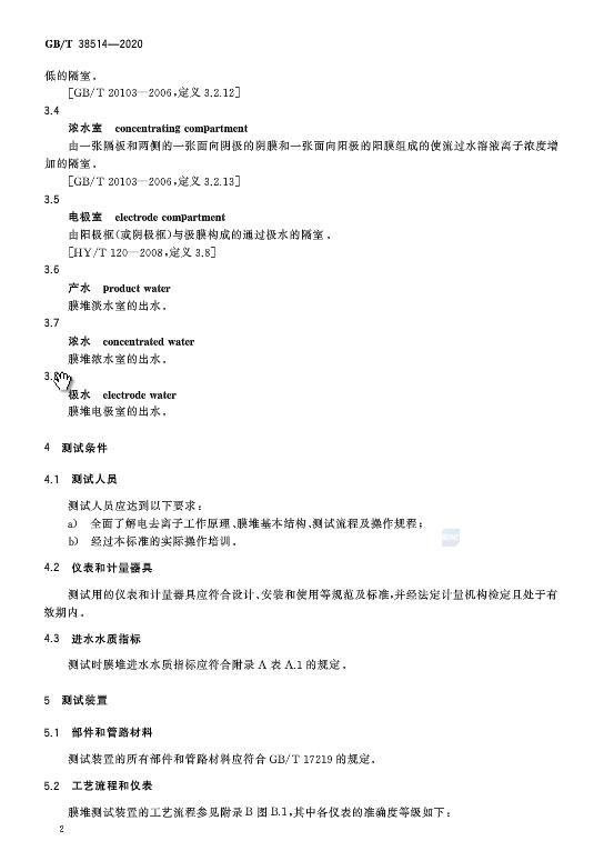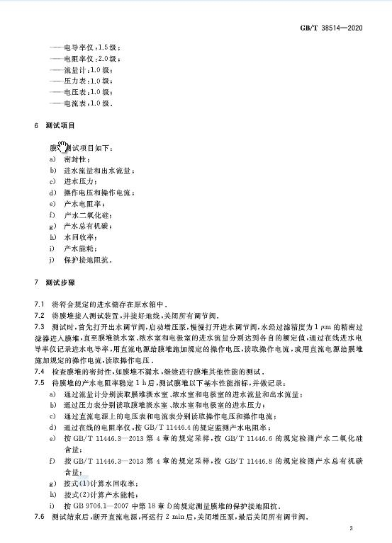 《電去離子膜堆測(cè)試方法》GB/T 38514-2020發(fā)布,2021年2月1日起施行