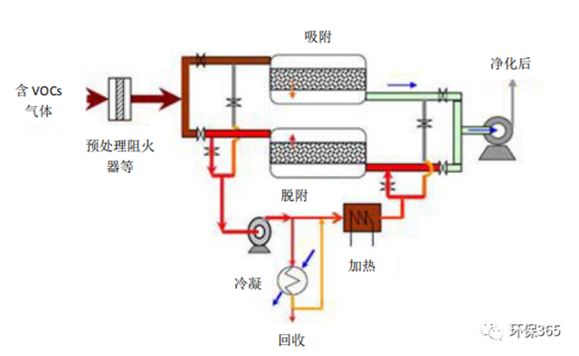 該技術(shù)采用多級(jí)冷凝技術(shù),使廢氣的有機(jī)成分在常壓下凝結(jié)成液體析出,經(jīng)凈化后的廢氣進(jìn)入吸附器進(jìn)一步吸附富集,同時(shí)確保達(dá)標(biāo)排放。吸附飽和后的吸附劑(活性炭、沸石等)等采用負(fù)壓脫附方式再生吸附劑,并將高濃度 VOCs 送回前端冷凝裝置。