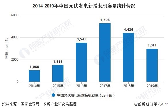 據(jù)國家能源局統(tǒng)計數(shù)據(jù)顯示,2017年,我國光伏發(fā)電新增裝機容量為5306萬千瓦,創(chuàng)歷史新高。2018年之后,受光伏531新政影響,各地光伏發(fā)電新增項目有所下滑。2019年,全國新增光伏發(fā)電裝機3011萬千瓦,同比下降31.6%。累計裝機容量已增長至20430萬千瓦。
