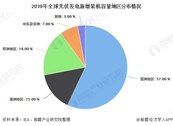 新增裝機容量方面,據(jù)IEA統(tǒng)計數(shù)據(jù)顯示,2019,以中國代表的亞洲地區(qū)新增光伏裝機容量占據(jù)全球光伏發(fā)電新增裝機容量半數(shù)以上,總計占比達到57%;歐洲和美洲地區(qū)緊隨其后,新增裝機容量占比分別為18%和15%。