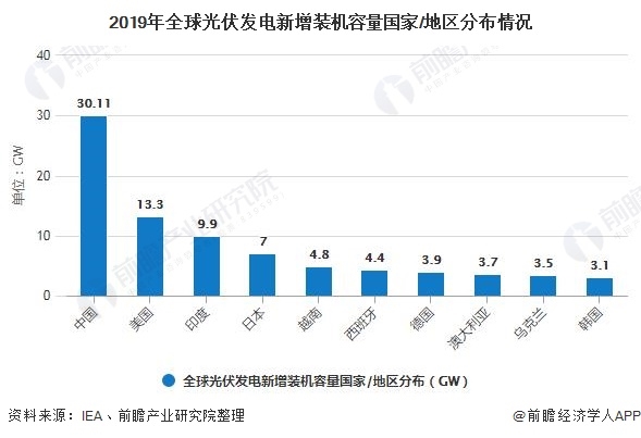 具體到各地區(qū)國家來看,2019年全球光伏發(fā)電新增裝機容量前十國家依次為中國、美國、印度、日本、越南、西班牙、德國、澳大利亞、烏克蘭、韓國。前十國家新增裝機占比達到73%,較2018年有所下降。其中,中國光伏市場連續(xù)第二年收縮,2019年新增光伏裝機容量為30.11GW。