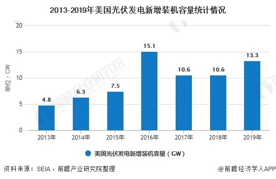 根據(jù)美國太陽能工業(yè)協(xié)會(SEIA)發(fā)布的數(shù)據(jù),2019年,美國太陽能光伏發(fā)電新增裝機容量達到13.3GW,比2018年增長了23%,其中戶用光伏新增裝機創(chuàng)紀(jì)錄達到2.8GW。