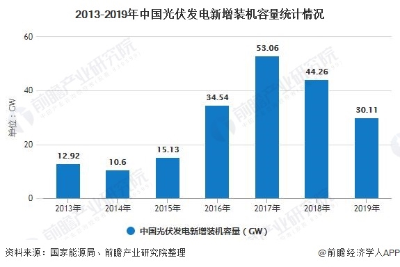 我國太陽能光伏行業(yè)雖起步較晚,但發(fā)展迅速,尤其是2013年以來,在國家及各地區(qū)的政策驅(qū)動下,太陽能光伏發(fā)電在我國呈現(xiàn)爆發(fā)式增長,據(jù)國家能源局統(tǒng)計數(shù)據(jù)顯示,2017年,我國光伏發(fā)電新增裝機容量為53.06GW,創(chuàng)歷史新高,2018年,受光伏531新政影響,各地光伏發(fā)電新增項目有所下滑,全年新增裝機容量為44.26GW,同比下降16.6%。